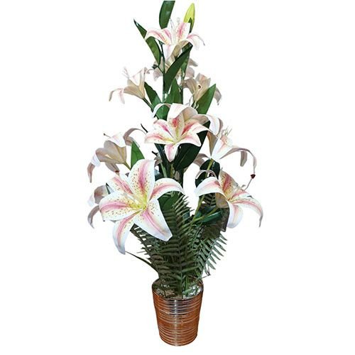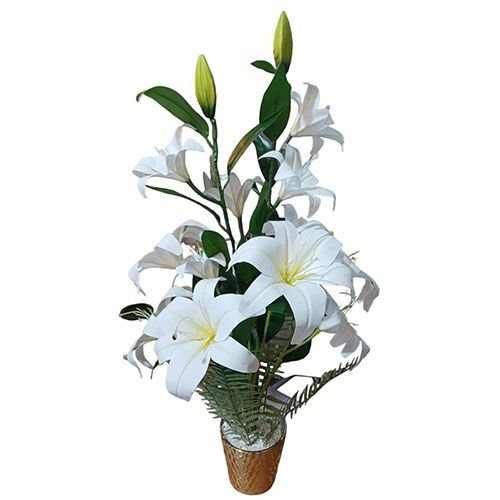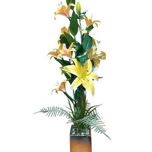 Nuestro Arreglo de Lirios Artificiales combina lo mejor de ambos mundos: la estética natural y la facilidad de mantenimiento.